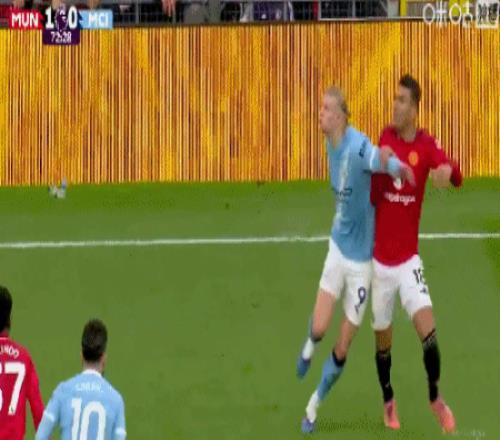 第72分钟,卡塞米罗和哈兰德接触后倒地,裁判没有吹罚犯规